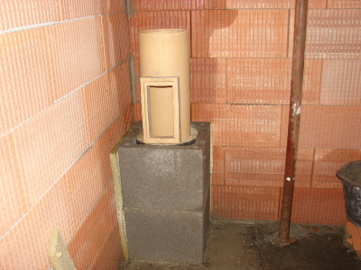 Der Schornstein entsteht. Von oben läuft das Wasser durch die Öffnung. Ob das der Dämmung gut tut? Wir werden den Bauleiter mal fragen!