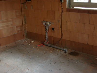 Der Klempner ist auch noch kräftig am werkeln. Heute wurden die Vorwandelemente für die Toiletten gesetzt und auf Anraten unserer Baubetreuerin der Außenwasserhahn nochmal versetzt.