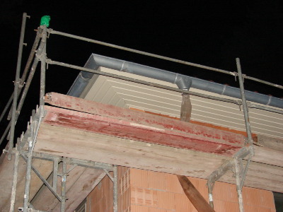 Morgens wurde noch fleißig gewerkelt. Die Dachrinnen sind dran, der Schornstein ragt über das Dach. Die ersten Bretter vom Dachkasten sind gestrichen (juhu, die Farbe stimmt!). Die Durchbrüche für die Heizkreisverteiler sind gestemmt. Einige Schweißbahnen im EG wurden auch noch verlegt. Wir haben noch eimerweise Wasser aus dem Schlafzimmer getragen.